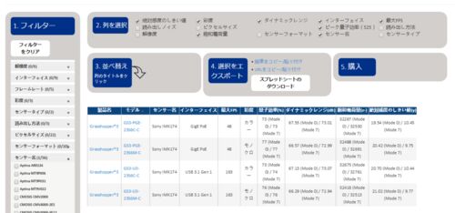 FLIR(PointGrey)のWEBページが刷新されていました。 FLIR USB 3.1, Gigabit Ethernet and FireWire Machine Vision Cameras 調べたいセンサー名等、絞り込むことが出来ます。(画面左列) 更に列を選択して、見たい項目も絞り込み出来ます。(画面上) こん…